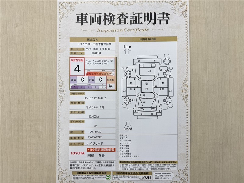 トヨタ自動車が認定した検査員が、厳正に検査した車両検査証明書を発行しています。キズの程度や場所を展開図で分かりやすく表示しているのでおクルマの状態がすぐ分かります。