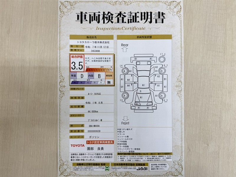 トヨタ自動車が認定した検査員が、厳正に検査した車両検査証明書を発行しています。キズの程度や場所を展開図で分かりやすく表示しているのでおクルマの状態がすぐ分かります。