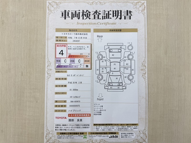 トヨタ自動車が認定した検査員が、厳正に検査した車両検査証明書を発行しています。キズの程度や場所を展開図で分かりやすく表示しているのでおクルマの状態がすぐ分かります。