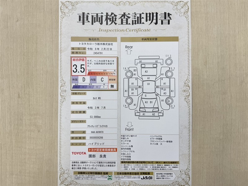 トヨタ自動車が認定した検査員が、厳正に検査した車両検査証明書を発行しています。キズの程度や場所を展開図で分かりやすく表示しているのでおクルマの状態がすぐ分かります。