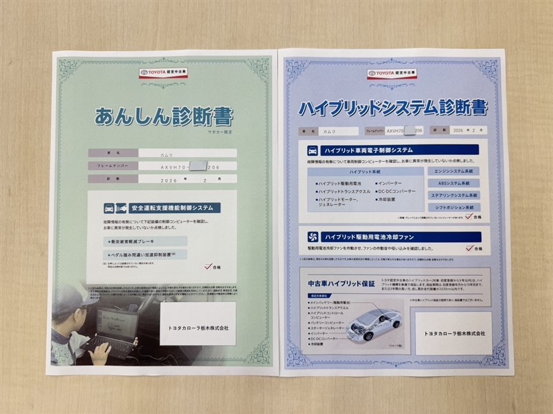 「サポカーあんしん診断」「ハイブリットシステム診断」実施済み。安心安全にお乗り頂けるようトヨタ専用診断機器で綿密にシステムを点検しています。