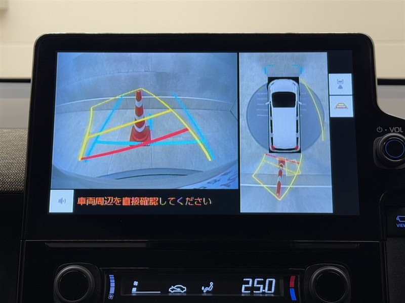真上から見下ろしたような視点で車とその周囲を確認出来る画面と、車両後方を映し出すバックガイドモニター画面の2つを表示してくれます。