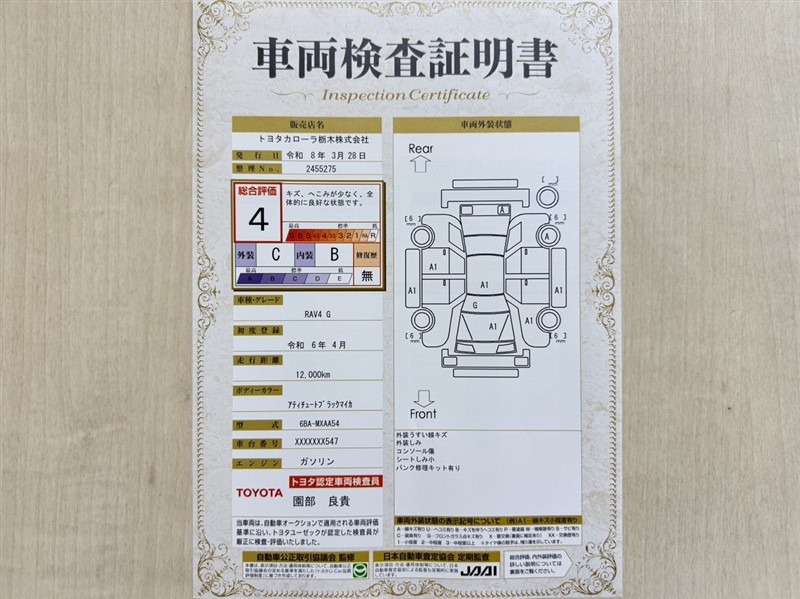 トヨタ自動車が認定した検査員が、厳正に検査した車両検査証明書を発行しています。キズの程度や場所を展開図で分かりやすく表示しているのでおクルマの状態がすぐ分かります。