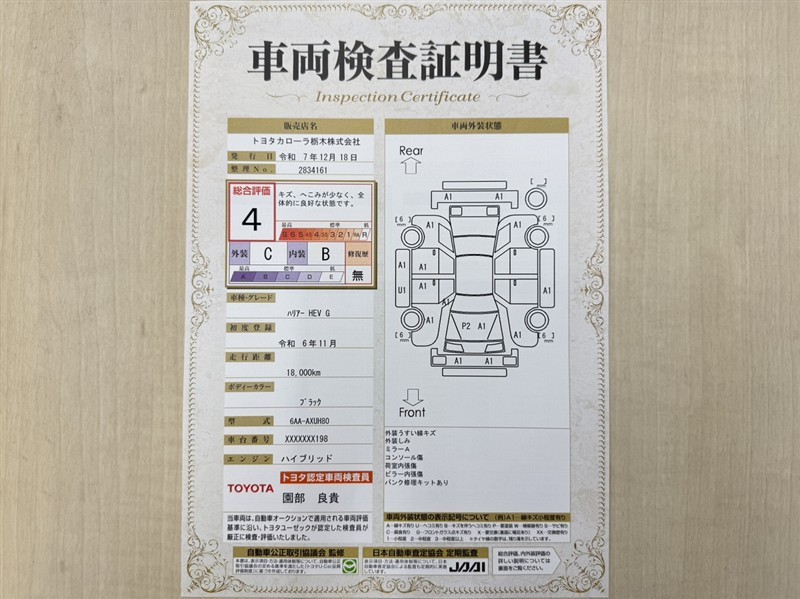 トヨタ自動車が認定した検査員が、厳正に検査した車両検査証明書を発行しています。キズの程度や場所を展開図で分かりやすく表示しているのでおクルマの状態がすぐ分かります。