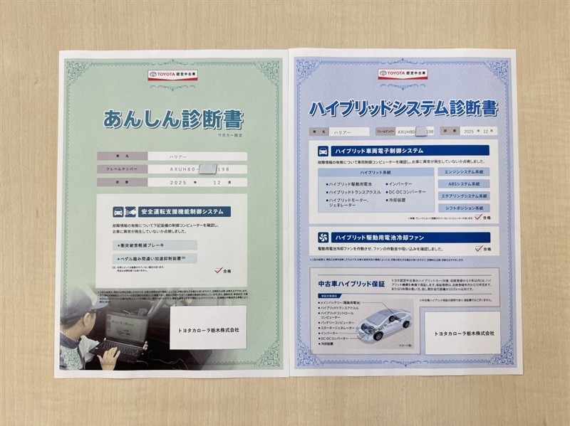 「サポカーあんしん診断」「ハイブリッドシステム診断」実施済み。トヨタ専用診断機器で安心安全にお乗り頂けるよう、綿密に点検しています。