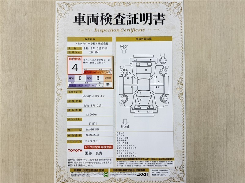 トヨタ自動車が認定した検査員が、厳正に検査した車両検査証明書を発行しています。キズの程度や場所を展開図で分かりやすく表示しているのでおクルマの状態がすぐ分かります。