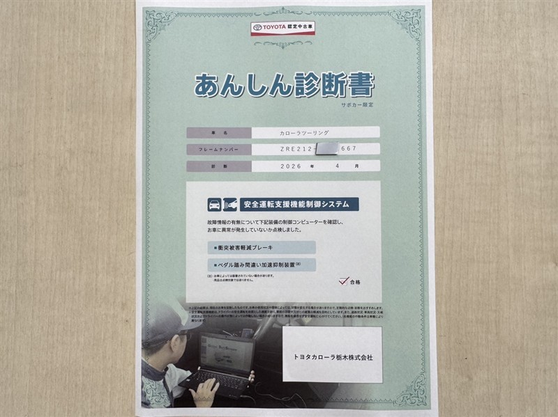 トヨタ自動車が認定した検査員が、厳正に検査した車両検査証明書を発行しています。キズの程度や場所を展開図で分かりやすく表示しているのでおクルマの状態がすぐ分かります。
