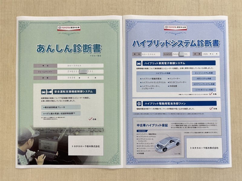 「サポカーあんしん診断」「ハイブリットシステム診断」実施済み。安心安全にお乗り頂けるようトヨタ専用診断機器で綿密にシステムを点検しています。