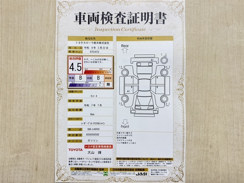 トヨタ自動車が認定した検査員が、厳正に検査した車両検査証明書を発行しています。キズの程度や場所を展開図で分かりやすく表示しているのでおクルマの状態がすぐ分かります。