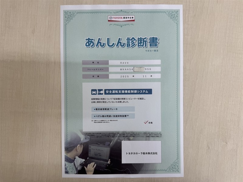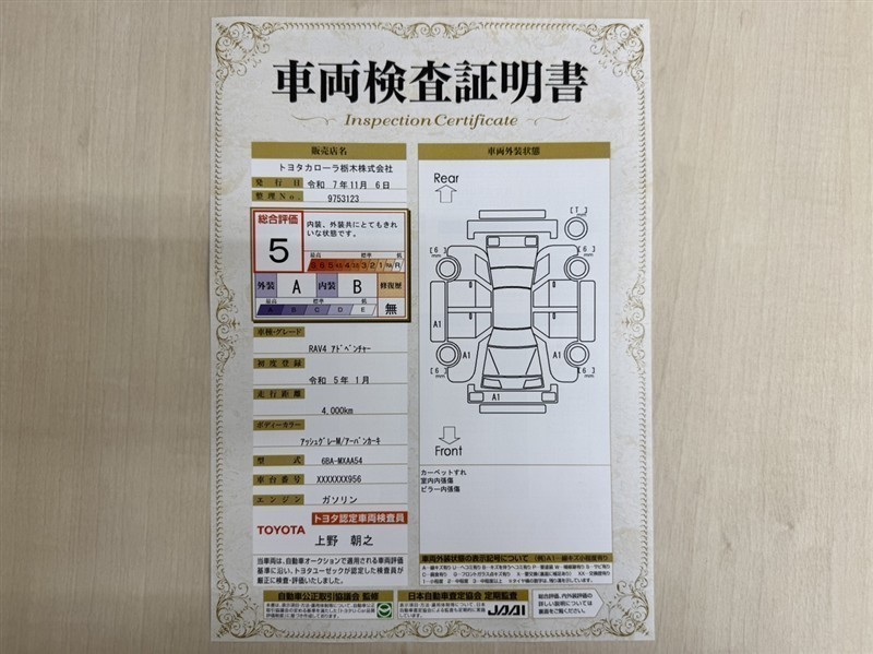トヨタ自動車が認定した検査員が、厳正に検査した車両検査証明書を発行しています。キズの程度や場所を展開図で分かりやすく表示しているのでおクルマの状態がすぐ分かります。