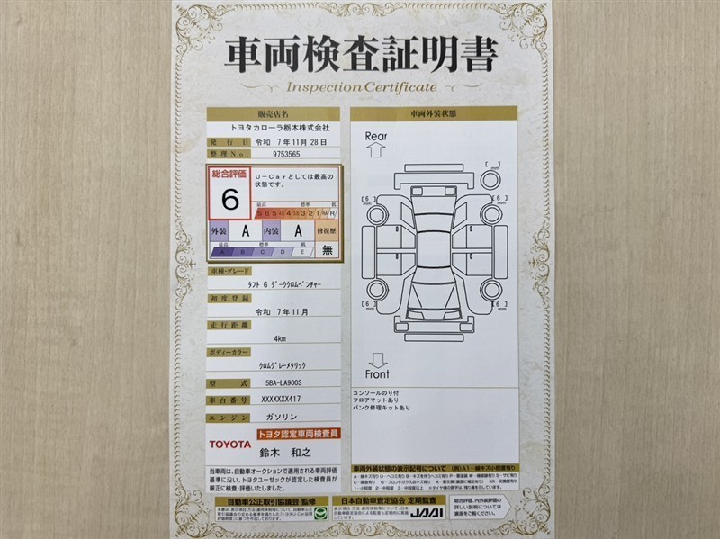 トヨタ自動車が認定した検査員が、厳正に検査した車両検査証明書を発行しています。キズの程度や場所を展開図で分かりやすく表示しているのでおクルマの状態がすぐ分かります。