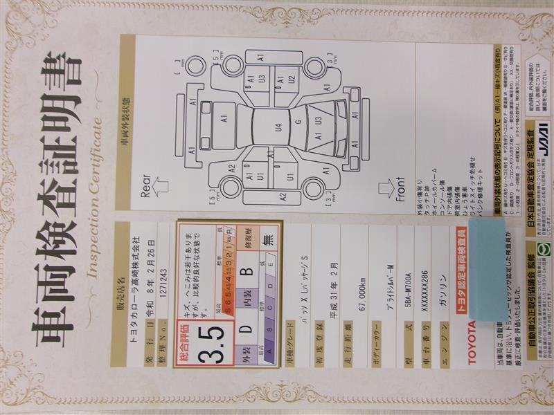 車両検査証明書です!お車の状態を、ありのまま記載しています。車種・グレード・走行距離・内外装の評価などのご参考に♪