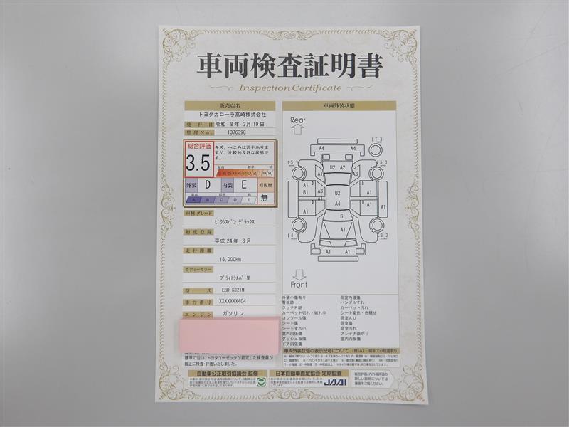 車両検査証明書です!お車の状態を、ありのまま記載しています。車種・グレード・走行距離・内外装の評価などのご参考に♪