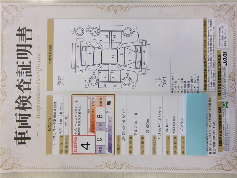 車両検査証明書です!お車の状態を、ありのまま記載しています。車種・グレード・走行距離・内外装の評価などのご参考に♪