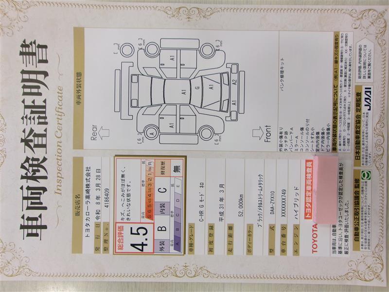 車両検査証明書です!お車の状態を、ありのまま記載しています。車種・グレード・走行距離・内外装の評価などのご参考に♪