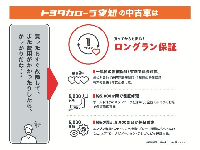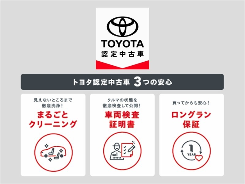 ロングラン保証付き。トヨタのお店で中古車をお買い上げいただいたすべてのお客様に安心で快適なカーライフをお約束する1年間の保証です。