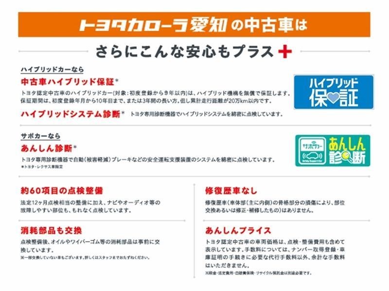 「中古車ハイブリッド保証」付き。ハイブリッド機構を無償で保証します。保証期間は、初度登録年月から10年目まで、またはロングラン保証が終わってから3年間。ただし累計走行距離が20万km以内です。