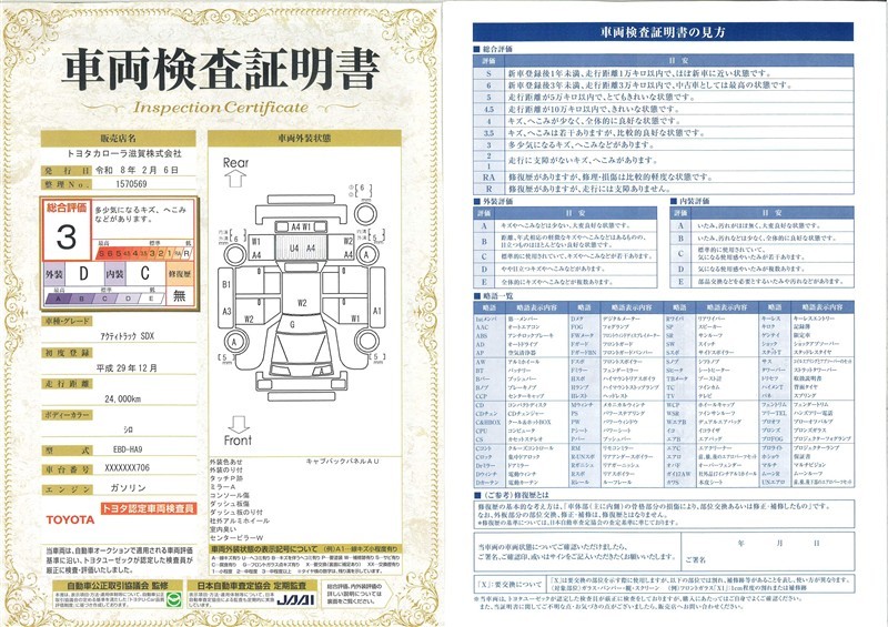 ◆車両検査証明書◆修復歴やクルマの状態を正しく評価できる「トヨタ認定車両検査員」が1台1台クルマの状態を評価。総合評価は10段階、内装・外装は5段階で点数表示。クルマ選び・購入前の安心をお届けします!