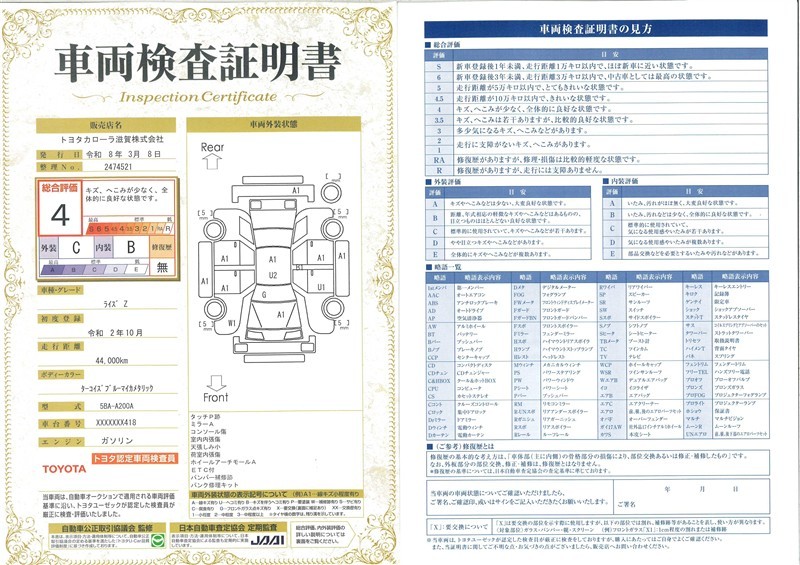 ◆車両検査証明書◆修復歴やクルマの状態を正しく評価できる「トヨタ認定車両検査員」が1台1台クルマの状態を評価。総合評価は10段階、内装・外装は5段階で点数表示。クルマ選び・購入前の安心をお届けします!