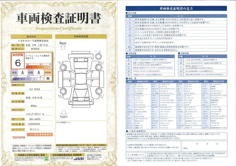◆車両検査証明書◆修復歴やクルマの状態を正しく評価できる「トヨタ認定車両検査員」が1台1台クルマの状態を評価。総合評価は10段階、内装・外装は5段階で点数表示。クルマ選び・購入前の安心をお届けします!
