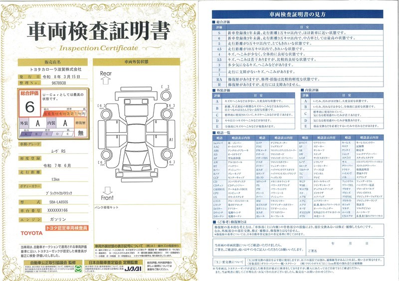 ◆車両検査証明書◆修復歴やクルマの状態を正しく評価できる「トヨタ認定車両検査員」が1台1台クルマの状態を評価。総合評価は10段階、内装・外装は5段階で点数表示。クルマ選び・購入前の安心をお届けします!