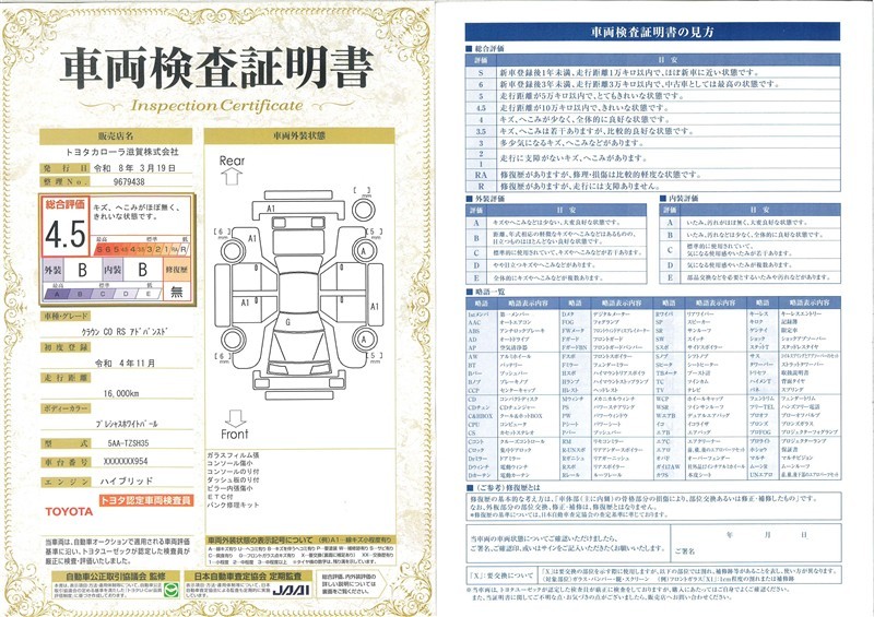 ◆車両検査証明書◆修復歴やクルマの状態を正しく評価できる「トヨタ認定車両検査員」が1台1台クルマの状態を評価。総合評価は10段階、内装・外装は5段階で点数表示。クルマ選び・購入前の安心をお届けします!