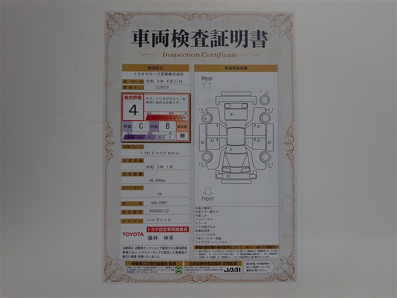 車両検査証明書付きです!だれでも中古車の状態がすぐにわかるよう、車のプロが客観的に評価。車両の状態やわずかなキズも正確にお伝えします。