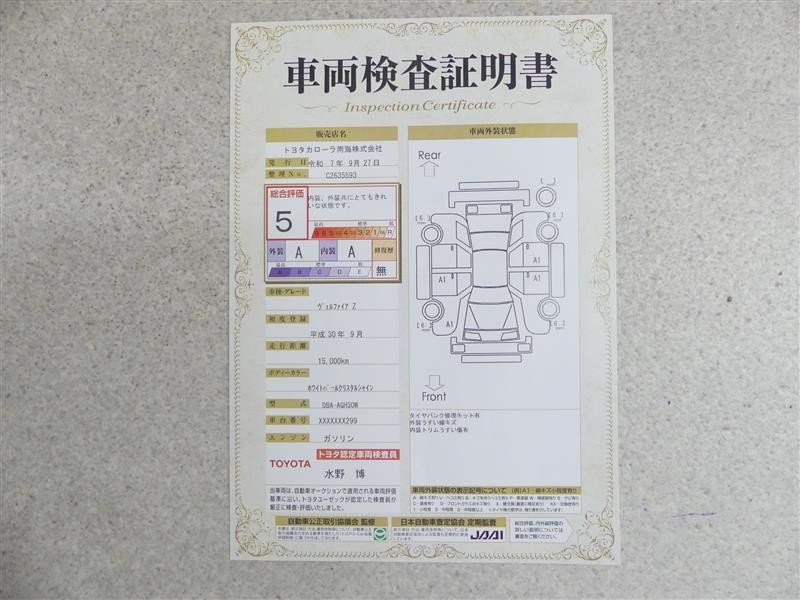 トヨタ車のプロの検査員が実施した「車両検査証明書」付き!車両の状態をこれ1枚でチェックできます!