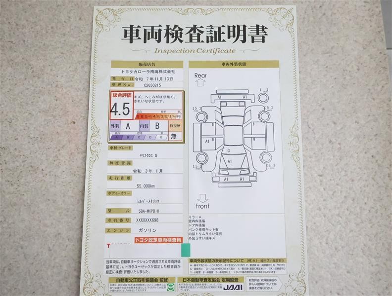 トヨタ車のプロの検査員が実施した「車両検査証明書」付き!車両の状態をこれ1枚でチェックできます!