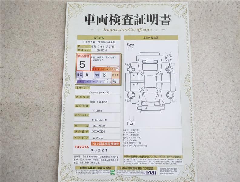 トヨタ車のプロの検査員が実施した「車両検査証明書」付き!車両の状態をこれ1枚でチェックできます!