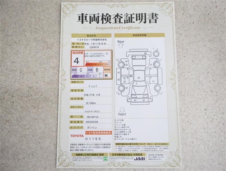 トヨタ車のプロの検査員が実施した「車両検査証明書」付き!車両の状態をこれ1枚でチェックできます!