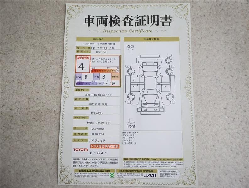 トヨタ車のプロの検査員が実施した「車両検査証明書」付き!車両の状態をこれ1枚でチェックできます!