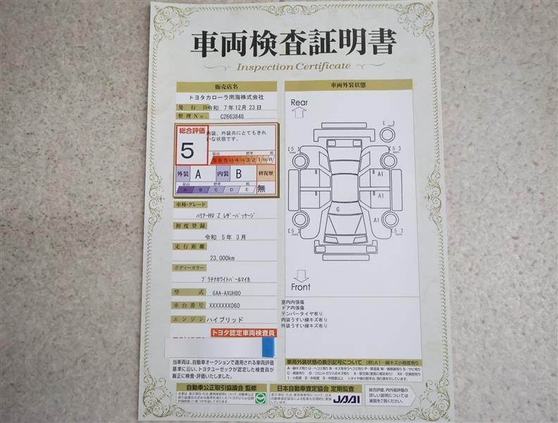 トヨタ車のプロの検査員が実施した「車両検査証明書」付き!車両の状態をこれ1枚でチェックできます!