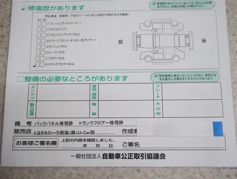 ※ 「修復歴あり」の場合、修復部位の詳細につきましては、販売店へお問い合わせください。