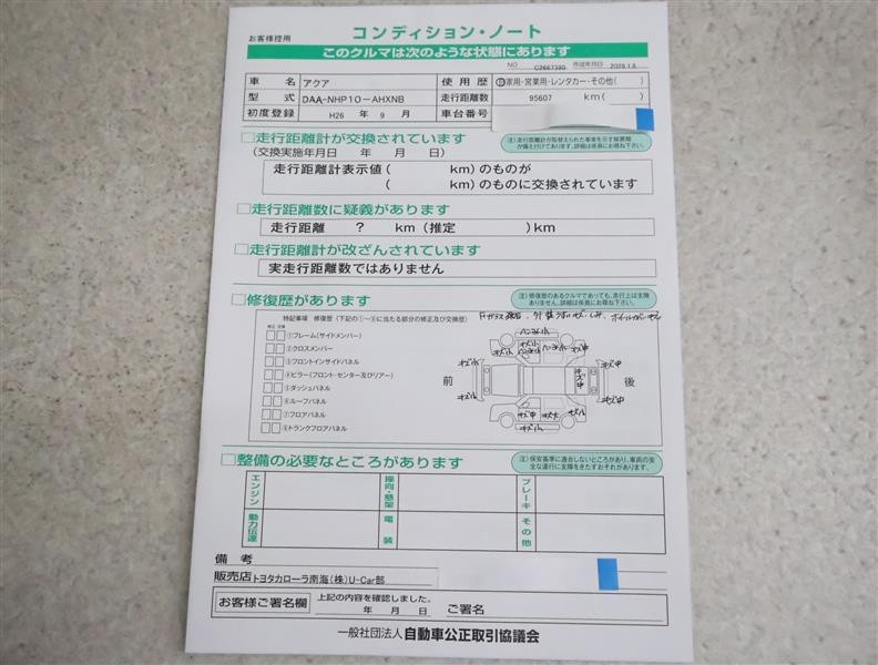 車両状態を示したコンディションノート。