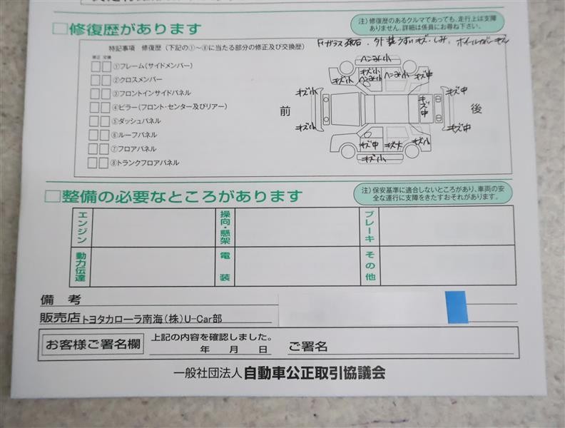 ※ 「修復歴あり」の場合、修復部位の詳細につきましては、販売店へお問い合わせください。