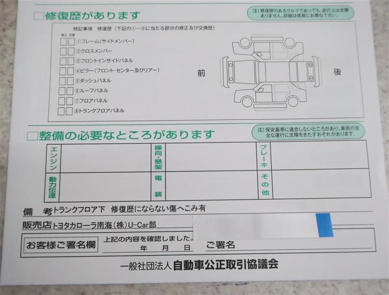 ※ 「修復歴あり」の場合、修復部位の詳細につきましては、販売店へお問い合わせください。