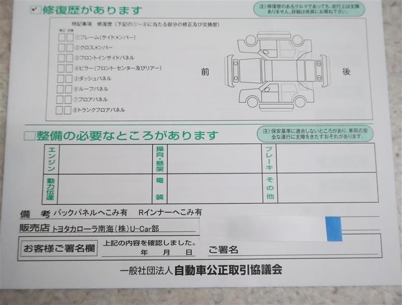 ※ 「修復歴あり」の場合、修復部位の詳細につきましては、販売店へお問い合わせください。