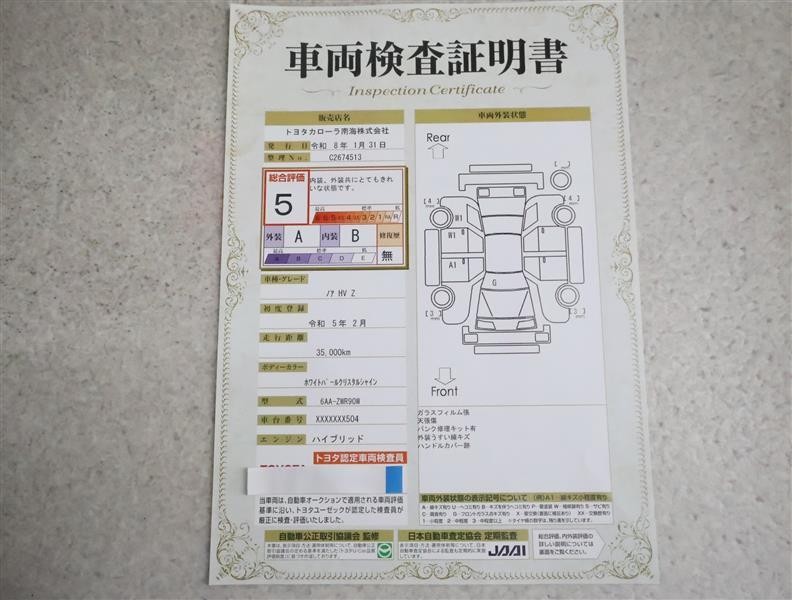 トヨタ車のプロの検査員が実施した「車両検査証明書」付き!車両の状態をこれ1枚でチェックできます!