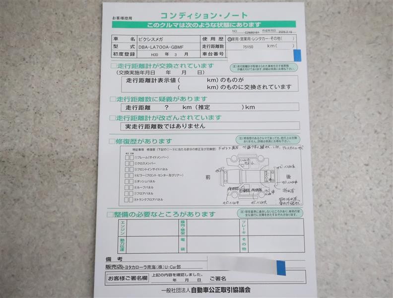※ 「定期点検整備なし(要整備箇所あり)」の場合、整備箇所につきましては、販売店へお問い合わせください。