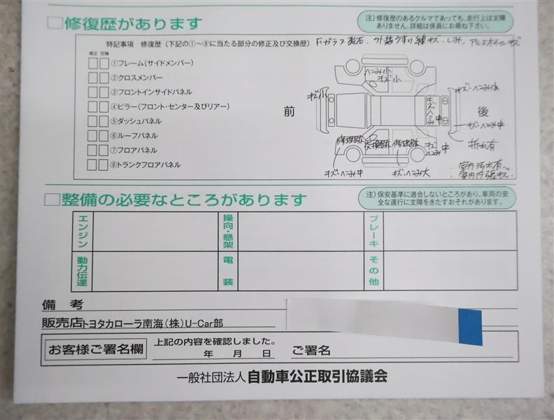 ※ 「修復歴あり」の場合、修復部位の詳細につきましては、販売店へお問い合わせください。