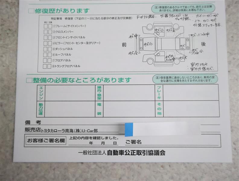 ※ 「修復歴あり」の場合、修復部位の詳細につきましては、販売店へお問い合わせください。