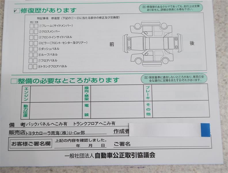 ※ 「修復歴あり」の場合、修復部位の詳細につきましては、販売店へお問い合わせください。
