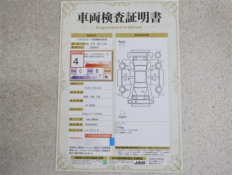 トヨタ車のプロの検査員が実施した「車両検査証明書」付き!車両の状態をこれ1枚でチェックできます!