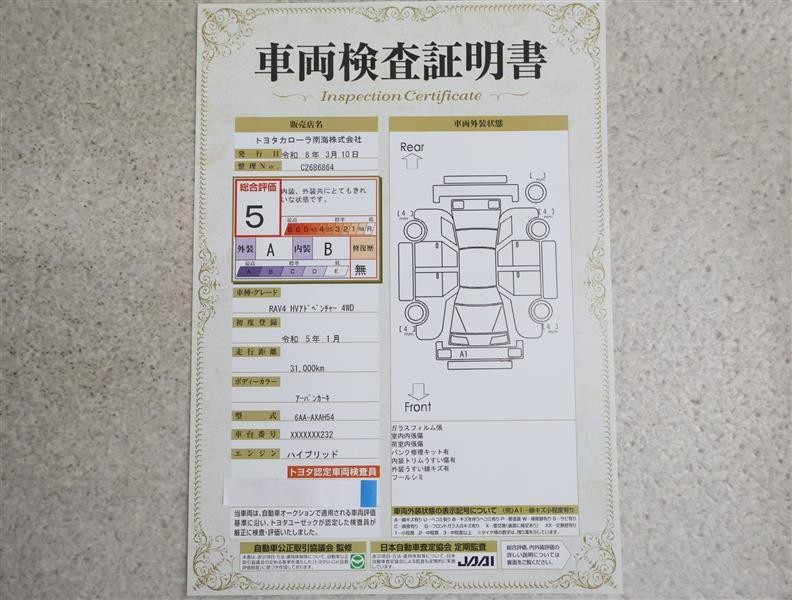 トヨタ車のプロの検査員が実施した「車両検査証明書」付き!車両の状態をこれ1枚でチェックできます!