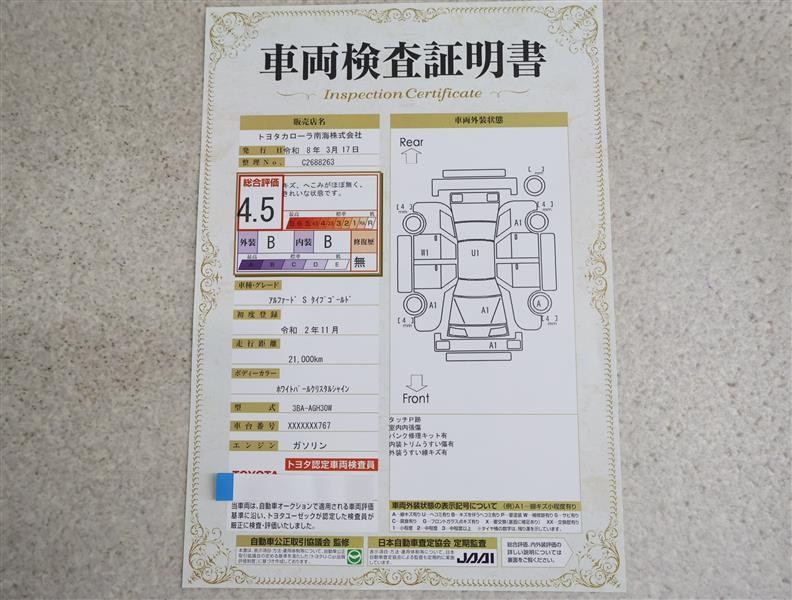 トヨタ車のプロの検査員が実施した「車両検査証明書」付き!車両の状態をこれ1枚でチェックできます!