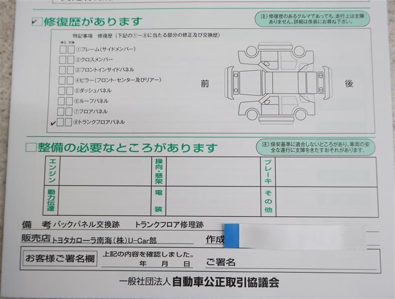 ※ 「修復歴あり」の場合、修復部位の詳細につきましては、販売店へお問い合わせください。