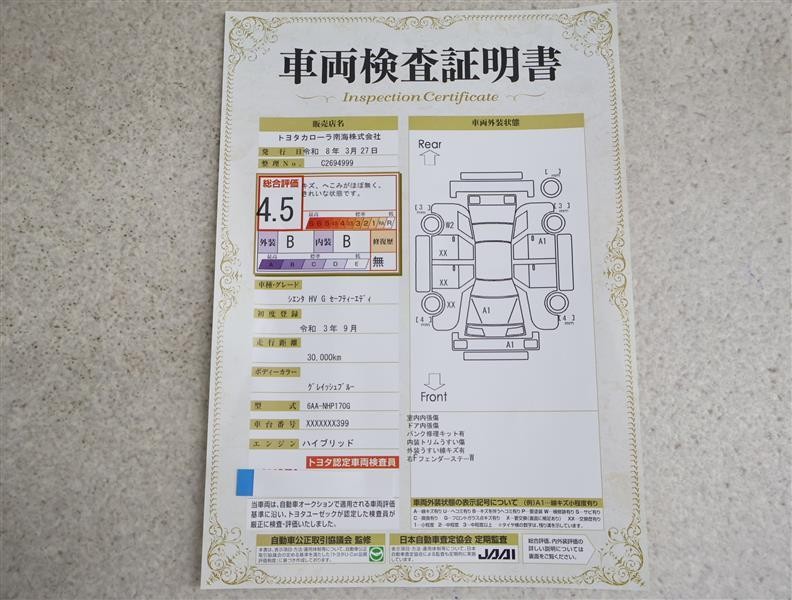 トヨタ車のプロの検査員が実施した「車両検査証明書」付き!車両の状態をこれ1枚でチェックできます!