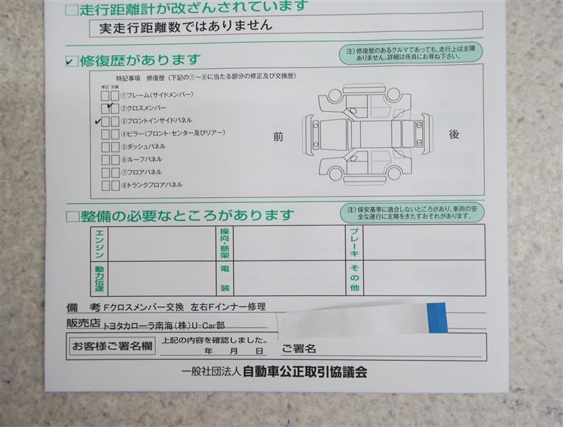 ※ 「修復歴あり」の場合、修復部位の詳細につきましては、販売店へお問い合わせください。