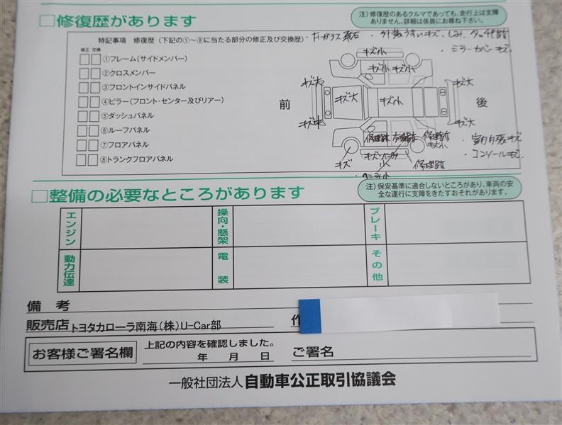 ※ 「修復歴あり」の場合、修復部位の詳細につきましては、販売店へお問い合わせください。